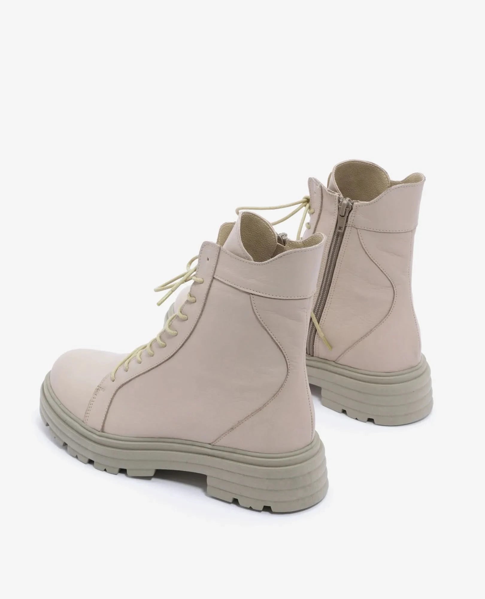 מגפונים במראה צבאי מעור איכותי בעבודת יד, שרוכים לאורך הרגל וסוליית טרקטור דומיננטית.