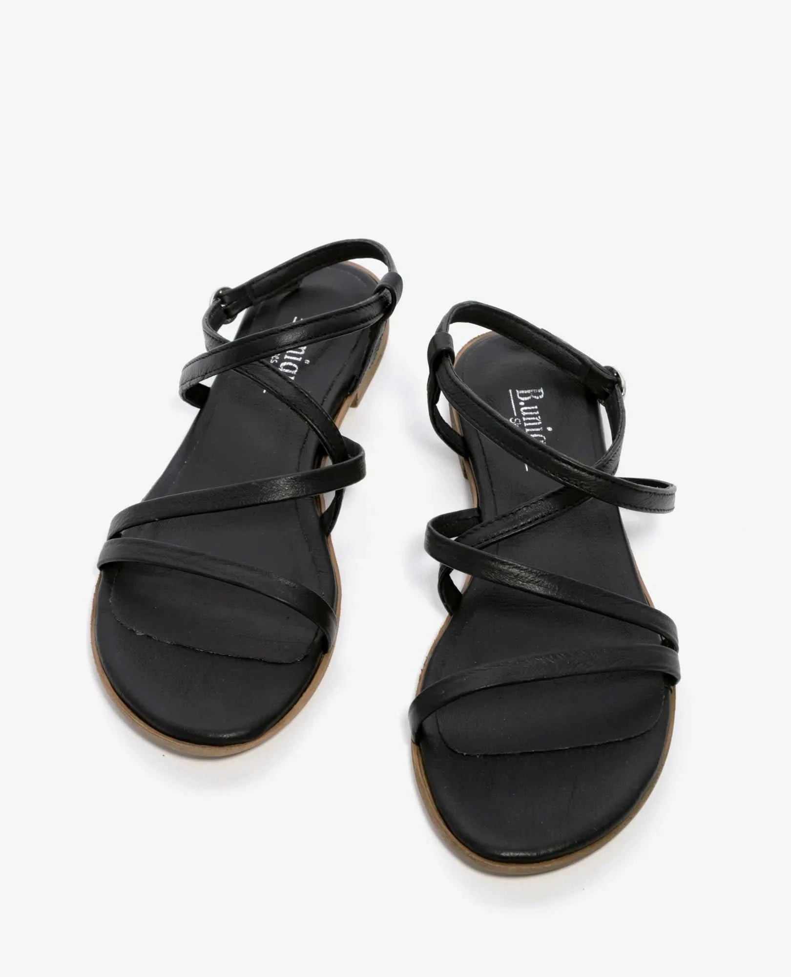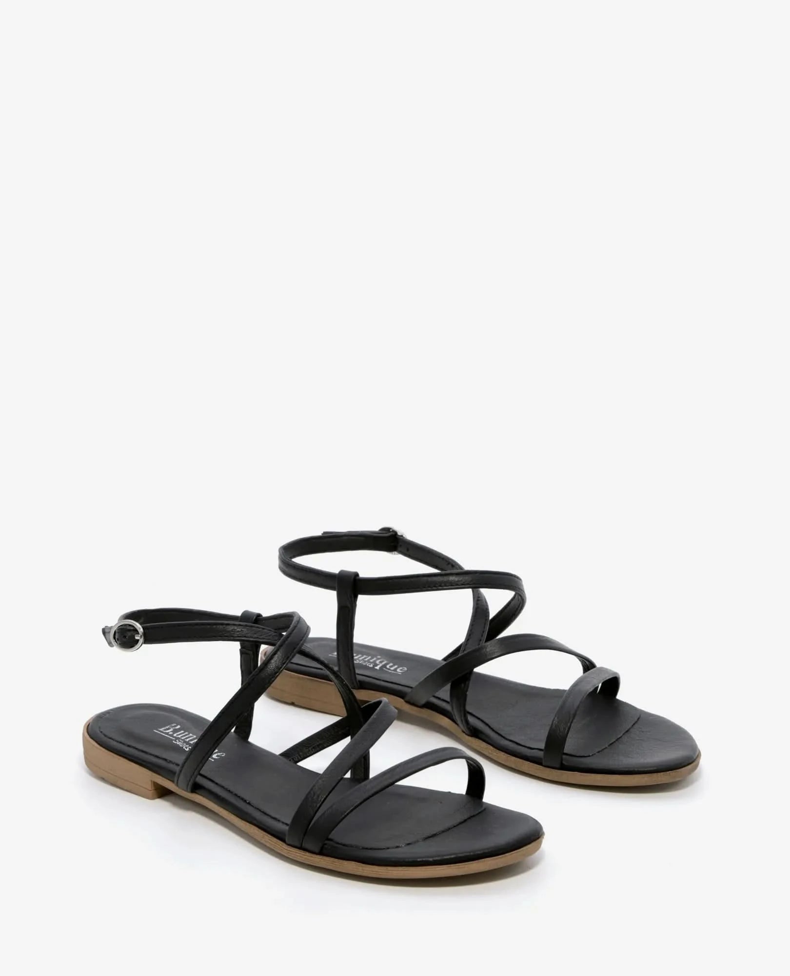 סנדלים שטוחים עם רצועות דקות ואבזם המתלפף על הקרסול, פרונט מעוגל קלאסי. מושלמים לאאוטפיט קליל ביום חמים.