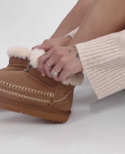 מגפונים עשויים מעור זמש איכותי עם תפרים בולטים ועיטור פרווה בקצה העליון.